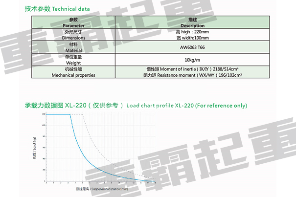XL型鋁合金軌道外形尺寸是220*100mm,每米重量10.7KG,在3米跨度之內載重1200KG,超過3米跨度,載重量會隨著跨度的變化而變化,在設計載重量的時候請咨詢重霸起重專業人員。